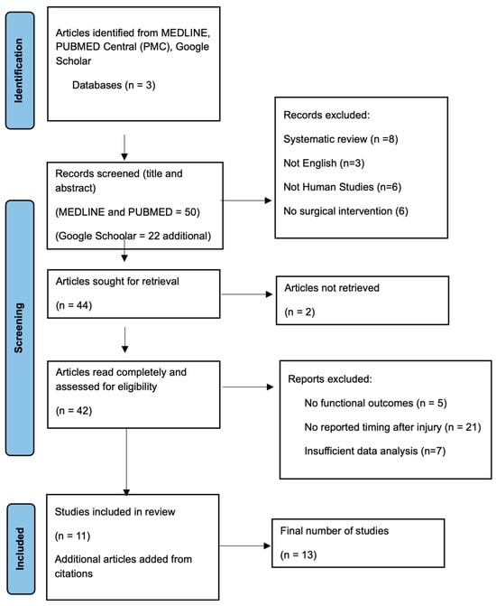 Initially, a systematic search was conducted across multiple databases, including MEDLINE, PubMed Central (PMC), and Google Scholar. Studies were last searched August 2024. A total of 72 records were identified using the search terms ((“rotator cuff tear” OR “rotator cuff injury”) AND ((“delayed repair” OR “delayed surgery” OR “acute repair” OR “early repair”) OR (“acute injury” OR “chronic injury” OR “nonhealing rotator cuff tear”))). After initial screening of titles, 44 records were retrieved for further evaluation. Following full-text assessment, 13 articles met the eligibility criteria and were included in the systematic review (Figure 1).