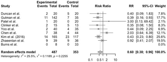 Meta-analysis of eight studies comparing retear rates between early and delayed RCR demonstrated a significant benefit associated with early intervention (Figure 2). The pooled risk ratio was 0.60 (95% CI: 0.38–0.96). Heterogeneity was low (I2 = 25.5%, p = 0.23), suggesting consistency across studies. Overall, the retear rate was 9.9% in the early group and 15.9% in the delayed group. Three studies reported retear rates greater than 20% [8,12,18]. The highest reported rate of retear was 42% in the delayed group of the Clinker et al. study [12].