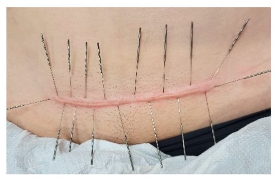 Dry needling is defined as an advanced technique that uses a fine needle to pierce the skin and stimulate the muscles and connective tissues beneath, with the goal of treating neuromuscular dysfunctions and movement limitations [9,10]. Dry needling is a therapeutic intervention that involves the insertion of fine needles into myofascial trigger points or taut bands within skeletal muscles. According to the American Physical Therapy Association, it is defined as a specialized technique that utilizes a thin needle to penetrate the skin and stimulate underlying muscle and connective tissue, with the primary objective of addressing neuromuscular dysfunction and movement impairments [11]. Several theories have been proposed to explain its mechanisms and therapeutic effects. It has been suggested that the local application of needles around the scars (Figure 1) effectively facilitates the scar healing process and alleviates pain and other scar-related symptoms. Dry needling may reduce scar tissue by mechanically disrupting fibrotic adhesions and stimulating a localized inflammatory response, which promotes collagen remodeling and improved tissue elasticity. This process also enhances microcirculation, accelerates tissue healing, and modulates inflammatory and nerve activity, which helps reduce pain and improve tissue function [4,12].