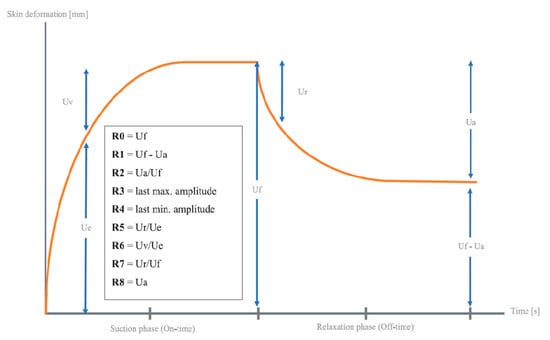 Cutometer output with R-parameters representing specific areas of skin recovery.