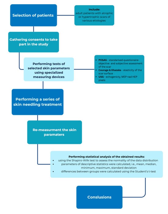 The results obtained were analyzed using the Statistica V 14.0. statistical program and Microsoft Office Excel 2019 software. Parameters of descriptive statistics, i.e., mean, median, minimum, maximum, and standard deviation, were also calculated. Statistical analyses were performed using the Shapiro–Wilk test to assess the normality of the data. Differences between dependent groups were tested with Student’s t-test and Wilcoxon test. The level of statistical significance was taken as p < 0.05. The entire course of the scientific experiment is shown as a flowchart (Figure 3).