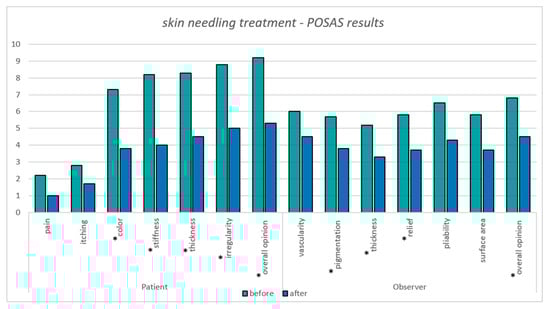 The POSAS is a validated scar assessment tool which allows for both objective (by the observer) and subjective (by the patient) assessment of the scar’s appearance and sensations. During the series of skin needling treatment, each of the participants as well as the investigator completed the POSAS questionnaire. The patients were blinded from the observers’ scores and rated their own scars using the patient component of the POSAS. The questionnaire was completed twice—before and after (without access to previous results) the series of treatment. The same researcher and patients completed the POSAS before and after treatment.