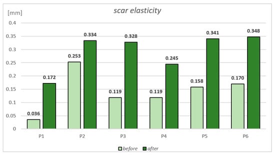 Significant improvement was also noted in patient P3 (cesarean section scar), with elasticity increasing by 176% (from 0.119 mm before to 0.328 mm after treatment).
