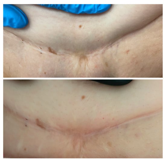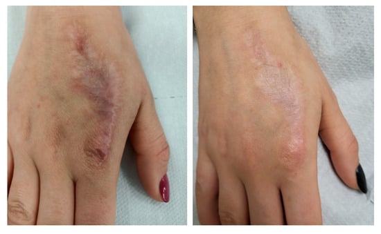 Upon completion of the procedure, a hydrocolloid gel (active ingredients: Panthenol, Carnosine, Silver Citrate, Allantoin) was applied to the treated area. In the case of scars located in exposed areas (e.g., a scar on the hand), a photoprotective cream containing mineral UV filters was used. The participants undergoing the procedure received written post-treatment care instructions and were thoroughly advised on how to manage and care for the treated area at home.