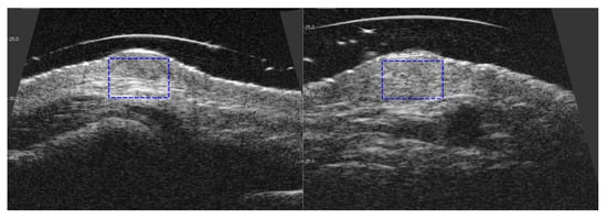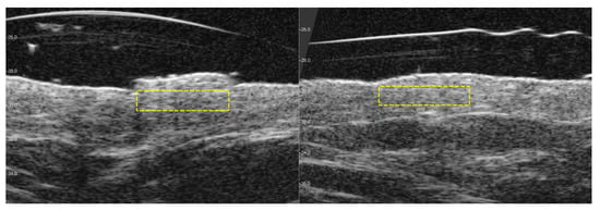 The measurements were conducted using a DermaMed Dramiński ultrasound device operating at a frequency of 48 MHz, which permits the detailed visualization of the epidermis, dermis, and the upper part of the subcutaneous tissue, reaching a depth of approximately 3–4 mm [19,24].