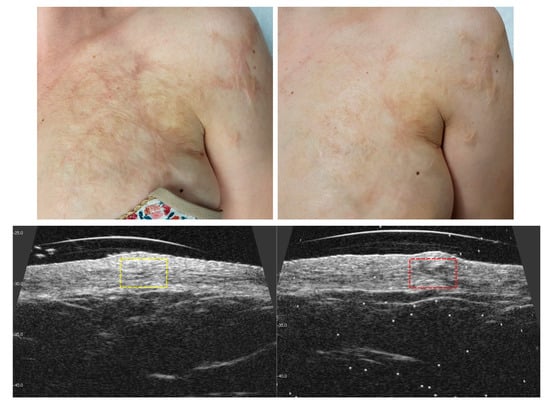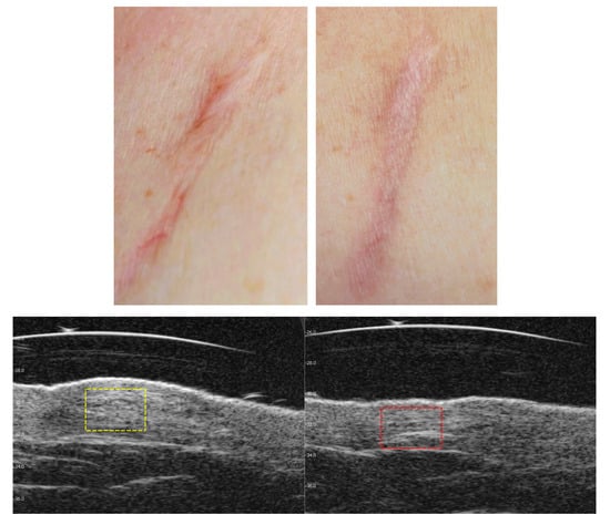 Ultrasound imaging enables the measurement and visualization of both healthy and affected skin structures. In the present study, improvement was observed in four out of six patients. When assessing scars, echogenicity of the skin is analyzed. Hyperechogenic areas (bright pixels) represent collagen fibers, which are often abnormally structured in scars and appear as bright zones. Patients P1, P2, P4, and P6 showed a reduction in bright pixels relative to the total pixels (TP). In our study, no substantial change in echogenicity was observed in patient P3, despite a noticeable improvement in elasticity (Cutometer® measurement) as well as visible scar reduction. This finding may be explained by the fact that patient P3 presented with the most hypertrophic scar among all study participants. It is important to note that the 48 MHz ultrasound probe used in this study has an optimal focal depth of approximately 3–4 mm. As a result, in the ultrasound image (Figure 9), a lower echogenicity band is visible beneath the elevated area of the scar, likely reflecting the structural characteristics of deeper scar tissue beyond the primary focus range of the transducer. Satpathy et al. [35] compared postoperative scar imaging using ultrasound and magnetic resonance imaging (MRI). The study involved 30 women with cesarean scars. Both imaging methods measured scar thickness before and after the incision. Bland–Altman analysis revealed minor errors in both methods, but ultrasound proved to be more accurate, with a precision of 96.7%, compared to approximately 90% for MRI. The results from both devices were comparable. Malinowska et al. [19] conducted a study on the reduction in acne scars using laser therapy. The DermaMed ultrasound device was used to measure scar parameters before and after treatment. The study involved seven patients aged 29 to 43 with facial acne scars. Significant improvements were noted in epidermal thickness (0.13 mm before and 0.11 mm after), depth (0.36 mm before and 0.29 mm after), and width (2.43 mm before and 2.35 mm after). No significant changes were observed in dermis thickness (1.22 mm before and 1.23 mm after).