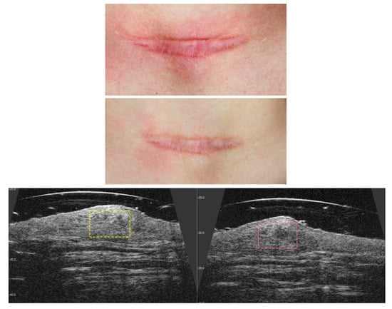 The POSAS is a subjective assessment method that relies on both the patient’s and the clinician’s evaluation of the scar’s characteristics. It is a standardized, two-part questionnaire that evaluates scar quality across visual, tactile, and sensory domains from both the clinician’s and the patient’s perspectives. The patient component consists of seven questions about the scar, including pain, itchiness, color, stiffness, thickness, irregularity, and an overall opinion. The observer scale includes an assessment of scar vascularity, pigmentation, thickness, relief, pliability, surface area, and an overall opinion. The POSAS ranges from 1 to 10, where a score of 1 is close to normal skin, and a score of 10 is the worst scar imaginable [16]. Ultrasound imaging is a safe, non-invasive and effective method for measuring skin and scar echogenicity. Modern brightness mode (B-mode) ultrasound, particularly high-frequency (i.e., ≥20 MHz) or ultra-high-frequency (30–100 MHz) ultrasonography, allows for differentiation between the epidermis and dermis [17,18]. Ultrasonography provides objective and quantitative information, which permits clinicians to identify the current state of the scar and evaluate treatment results [19,20].