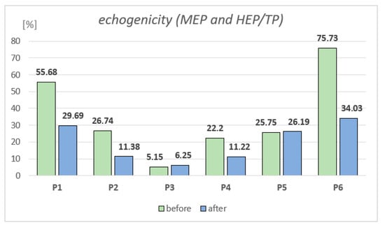 Figure 6, Figure 7, Figure 8, Figure 9, Figure 10 and Figure 11 present the visible effects and ultrasound images showing changes in echogenicity before and after treatment among patients. Following the measurements of skin echogenicity (Figure 12) in the scar areas of the patients, it was observed that in four cases (P1, P2, P4, and P6), there was a reduction in the ratio of MEP and HEP (bright pixels) to the total number of pixels (TP). For patient P1 (scar on the hand), the pre-treatment ratio of bright pixels to the total number of pixels was 55.68%, which decreased to 29.69% after therapy. In the case of the scar after oncological port placement in patient P2, echogenicity decreased from 26.74% to 11.39% following the treatment. The echogenicity of scar in P4 decreased from 22.20% to 11.22%.