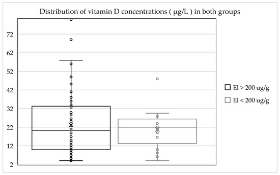 Inferential statistics revealed that the mean vitamin D concentration in group 1 (normal elastase 1) was 23.4 ± 17.13 μg/L (mean ± SD), while in group 2 (low elastase 1), it was 20.7 ± 11.35 μg/L. The calculated p-value for this difference was 0.491. The different groups are compared in Figure 2.