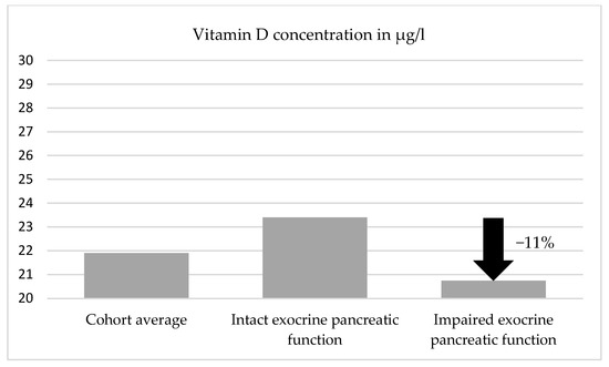 Our investigated patients reflected geriatric multimorbidity and had experienced an osteoporotic fracture. The prevalence of 25-hydroxyvitamin D (25(OH)D) deficiency was 70.6%, combined with a prevalence of exocrine pancreatic insufficiency of 16%. While a vitamin D deficiency was factually detectable in both groups, and was quantitatively 11% more pronounced in the group with exocrine pancreatic insufficiency, we did not find a statistically significant difference in baseline vitamin D levels between the groups. Specifically, the mean vitamin D level in the group with normal elastase 1 was 23.4 µg/L (SD 17.13), and in the group with low elastase 1, it was 20.7 µg/L (SD 11.35), with a p-value of 0.491. Despite this lack of statistical significance between groups, the actual presence of vitamin D deficiency in both groups and the observable quantitative difference is of significant clinical relevance for therapy planning. This observation, coupled with the understanding that an intact gastrointestinal tract and intact hepatic, renal, and metabolic functions are fundamental for producing active vitamin D in sufficient quantities under adequate sun exposure and enteral nutrition, highlights the importance of addressing this deficit. It is, however, crucial to acknowledge that the observation period was short and thus limited, preventing reliable conclusions about medium or long-term results. Furthermore, 25(OH)D level measurements are known to be subject to fluctuations of up to 30% [36].