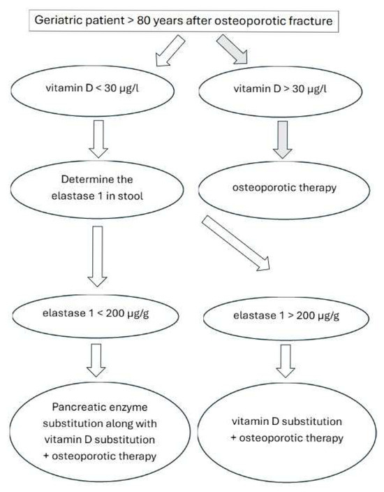 The prevalence of vitamin D deficiency in this specific cohort of orthogeriatric patients is remarkably high at 70%, with exocrine pancreatic insufficiency also prevalent at 16%, notably above that found in the general population. Our analysis revealed no statistically significant difference in baseline vitamin D levels between groups, despite a quantitatively 11% more pronounced deficiency in those with exocrine pancreatic insufficiency. However, we found a statistically significantly lower albumin level (p = 0.003) and albumin-corrected calcium levels (p = 0.012) in the group with abnormal exocrine pancreatic function. Crucially, after supplementation, there was a statistically significant difference in the mean increase of 25(OH)D levels (p = 0.024), with a considerably higher increase in the group without exocrine pancreatic insufficiency (mean 7.2 ± 4.7 µg/L vs. 3.6 ± 2.3 µg/L). Both groups presented with elevated parathormone levels, though with no statistically significant difference between them. These findings underscore the importance of routinely measuring vitamin D values, elastase 1, and parathormone in orthogeriatric inpatients to optimize management and improve bone health outcomes, especially given the attenuated response to vitamin D supplementation observed in patients with pancreatic insufficiency. A concise summary offering practical guidance is provided in Figure 3.