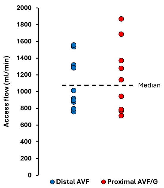 Vascular access flow in the study cohort at a median of 8.2 months after vascular access creation.