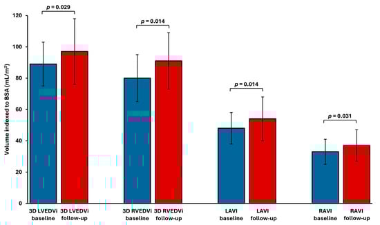 Pairwise comparisons of echocardiographic parameters demonstrated a significant increase in the volume of all cardiac chambers (Figure 2). The right ventricle showed the most pronounced remodeling. Indexed 3D RVEDVi increased by 19 ± 27%, while 3D LVEDVi increased by 11 ± 19%, LAVI by 13 ± 21%, and RAVI by 14 ± 24%. A significant increase in RV volume, defined as a ≥20% rise in 3D RVEDVi, was observed in 35% of patients (7 out of 20). Conventional 2D echocardiographic parameters of LV dimension and geometry showed no significant changes after AVF creation (Table 3). However, 2D RV basal diameter increased during follow-up.