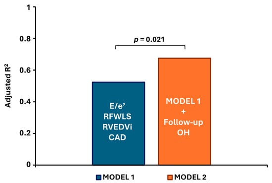 When follow-up overhydration was added to a multivariate model with baseline characteristics including E/e′, CAD, RVFWLS, and RVEDVi, the adjusted R2 increased from 0.523 to 0.675 (p = 0.021), confirming its independent and additive predictive value (Figure 3).