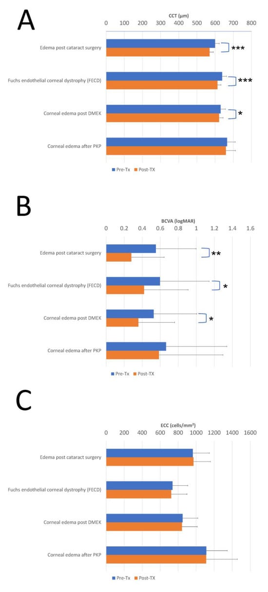 Parameter changes pre- and post-treatment in four corneal edema subgroups. Bar graphs illustrate the mean ± standard deviation values of CCT (μm), BCVA (logMAR), and ECC (cells/mm2) in pre- and post-treatment conditions. The x-axes represent absolute measured values for each parameter, and error bars represent standard deviation. (A) Central corneal thickness (CCT) demonstrates changes in CCT, defined as the distance between the anterior epithelial surface and the posterior endothelial surface. The reduction in CCT following treatment represents therapeutic resolution of corneal edema across all groups. (B) Best-corrected visual acuity presents visual acuity outcomes expressed in logarithm of the minimum angle of resolution (logMAR) units. (C) Endothelial cell count demonstrates changes in corneal endothelial cell density, measured as cells per square millimeter. CCT: central corneal thickness, BCVA: best-corrected visual acuity, ECC: endothelial cell count, FECD: Fuchs endothelial corneal dystrophy, DMEK: Descemet membrane endothelial keratoplasty, PKP: penetrating keratoplasty. Asterisks adjacent to the post-treatment bars indicate the level of statistical significance. * represents a statistically significant difference with p < 0.05, ** indicate p < 0.01, and *** indicate p < 0.001.