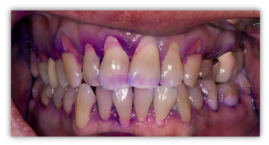 Intraoral photo of the dentition of a 45-year-old blind male participant in the Project: frontal view after plaque revelator application. Wedge-shaped tooth defects and gingival recessions caused by excessive toothbrushing are visible. No plaque is revealed on labial and buccal surfaces; however, newly deposited and mature plaque is visible interdentally, coloured in violet and blue, respectively, indicating lack of interdental cleaning. Although there is evidence of dental work, many extremely deep wedge-shaped defects were left untreated.