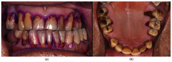 Poor oral/dental status of a 55-year-old smoker male participant in the Project: (a) frontal view of the dentition after plaque revelator application; (b) occlusal view of the upper dentition before application of plaque revelator (mirror image).