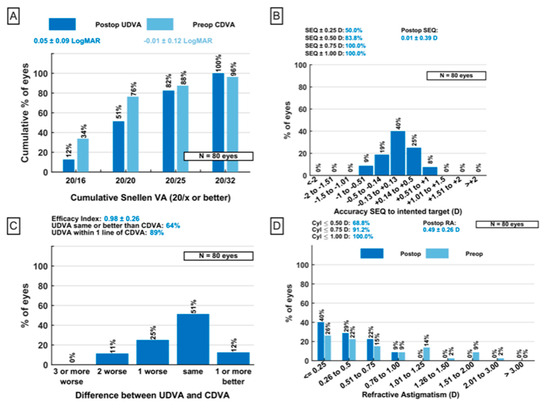 Refractive and visual acuity outcomes three months postoperatively: (A) Cumulative Snellen uncorrected and corrected distance visual acuity. (B) Postoperative residual spherical equivalent. (C) Efficacy index: Difference in Snellen visual acuity lines when postoperative UDVA and preoperative CDVA are compared. (D) Comparison of refractive cylinder pre- and postoperatively. UDVA = uncorrected distance visual acuity; CDVA = corrected distance visual acuity; VA = visual acuity; and D = diopters.