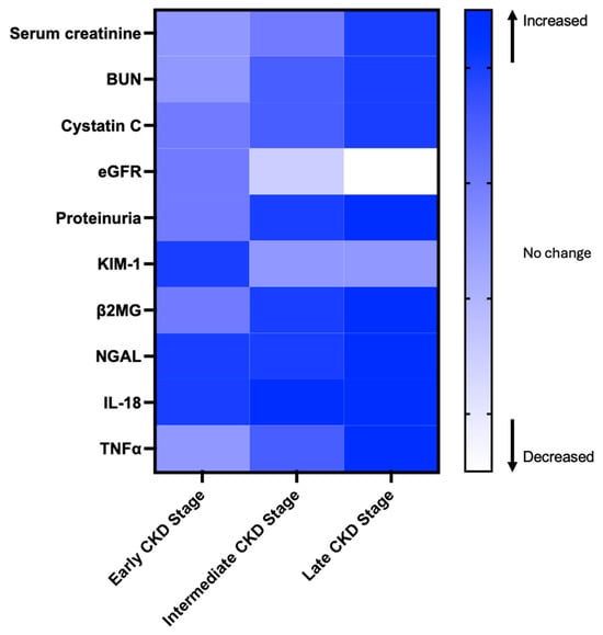 The heatmap illustrates changes in biomarker levels across different stages of chronic kidney disease (CKD). Color changes represent whether a biomarker is reported to increase or decrease, based on literature evidence. This figure is for visualization purposes only and does not reflect actual biomarker concentrations [70,71,72,73,74,75,76,77,78,79,80,81,82,83,84,85].