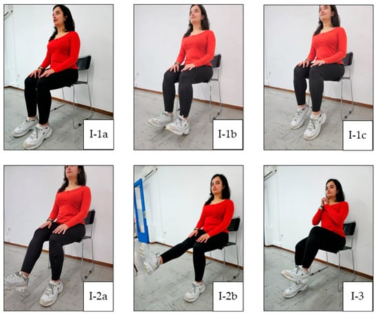 Warm up exercise. (I-1a) Starting position; (I-1b) dorsiflexion; (I-1c) plantar flexion; (I-2a) mid-range knee extension; (I-2b) full knee extension and isometric contraction; (I-3) knee lift.