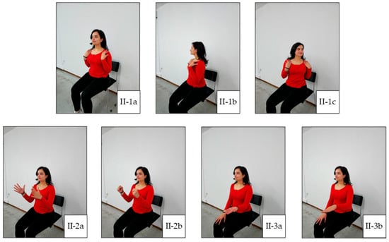 Main Exercise 1. (II-1a) Starting position for torso rotation; (II-1b) right rotation; (II-1c) left rotation; (II-2a) starting position for hand gripping; (II-2b) final position of hand gripping; (II-3a) forearm supination; (II-3b) forearm pronation.