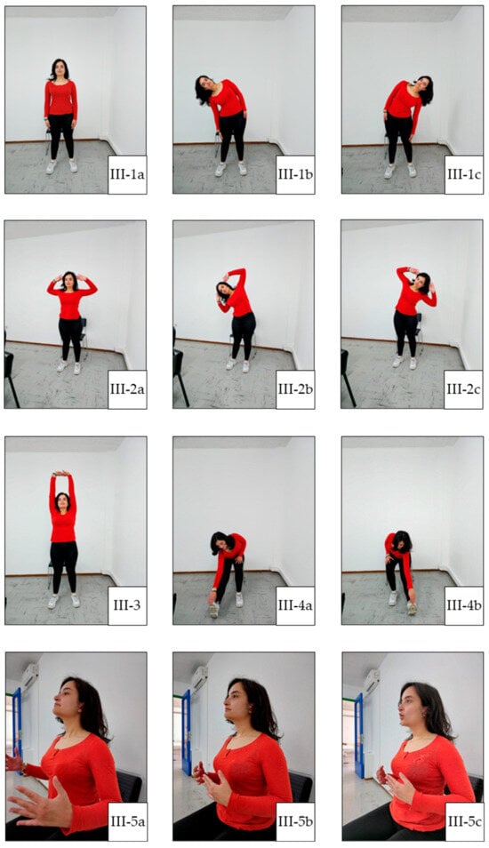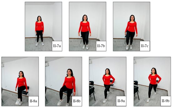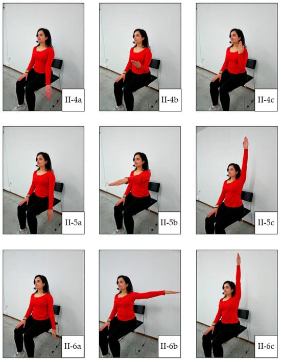 Main Exercise 2. (II-4a) Starting position of elbow flexion; (II-4b) mid-range of elbow flexion; (II-4c) end-range of elbow flexion; (II-5a) starting position of shoulder flexion; (II-5b) mid-position of shoulder flexion; (II-5c) final position of shoulder flexion; (II-6a) starting position of shoulder abduction; (II-6b) mid-position of shoulder abduction; (II-6c) final position of shoulder abduction.