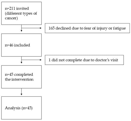 The study included 45 patients [20 women, 25 men] aged 53–85 years [mean ± SD: 69.02 ± 10.62] with various cancer types [e.g., hematological malignancies, ovarian cancer]. Patient recruitment is presented in Figure 6 as a flowchart. Of the 211 patients initially invited to participate, 165 declined due to concerns regarding potential injury or fatigue.