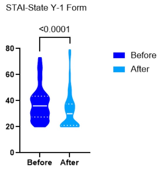 We used the Spielberger State–Trait Anxiety Inventory [STAI], which is a psychological inventory consisting of 40 self-report items on a 4-point Likert scale [25]. The STAI measures two types of anxiety—state anxiety [STAI-Y1] and trait anxiety [STAI-Y2]. For the purposes of this study, the STAI-State scale [Form Y-1] was employed, which specifically measures the levels of anxiety experienced at a given moment, referred to as “state anxiety”. This contrasts with “trait anxiety”, which reflects an individual’s general tendency to experience anxiety as a personality characteristic. We utilized the Greek-translated version of the STAI, validated by Liakos and Giannitsis in 1984 [26].