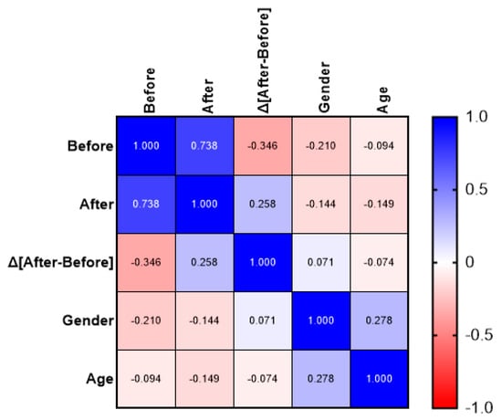 Spearman’s rho did not reveal any significant correlations between age, gender, and the STAI scale values. The only significant correlation was a strong positive correlation between the before and after anxiety values [rho = 0.738, p < 0.001, 95% Confidence Interval [CI]: 0.5610–0.8502]. All other Spearman’s rho data had large confidence intervals and did not permit definitive conclusions about the strength of the observed relationships. Spearman’s rho correlation analysis is summarized in Figure 8.