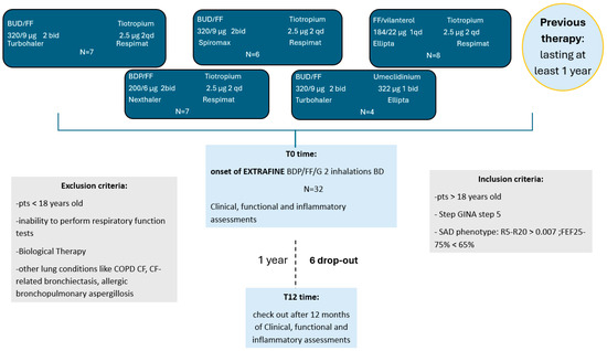 We defined T0 as the baseline moment of the study, coinciding with the discontinuation of previous “open” triple therapy (ICS/LABA + LAMA in two separate inhalers), used for at least 12 months, and the initiation of a “closed” triple therapy in a single extra-fine inhaler containing beclomethasone dipropionate, formoterol fumarate, and glycopyrronium (BDP/FF/GLY). The new therapy was prescribed and initiated on the same day that baseline data were collected. Patients were re-evaluated after 12 months (T12).