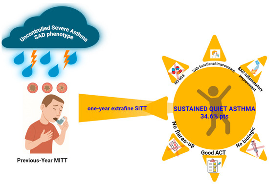 Building on these concepts, this study investigates whether transitioning patients with severe asthma and SAD from open triple therapy to a single-inhaler extra-fine triple therapy can lead to a state of sustained clinical and functional control—termed Steady Quiet Asthma (SQA)—characterized by clinical stability, the absence of exacerbations or OCS use, and an improvement in small airway function. The study also aims to assess whether baseline functional parameters, particularly impulse oscillometry indices, can predict the achievement of SQA, thereby supporting a personalized, biologic-sparing treatment approach.