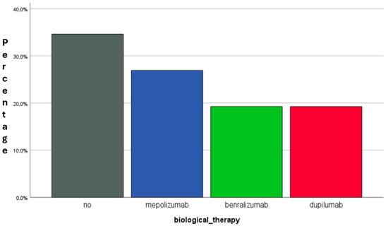 By the end of the 12-month period, 9 patients (34.6%) achieved sustained clinical stability without requiring biologic therapy, constituting the “Sustained Quiet Asthma” (SQA) group. Conversely, 17 patients (65.4%) required the initiation of biologic therapy due to persistent clinical instability. The biologic agents prescribed included mepolizumab (n = 7, 26.9%), benralizumab (n = 5, 19.2%), and dupilumab (n = 5, 19.2%) (Figure 3).