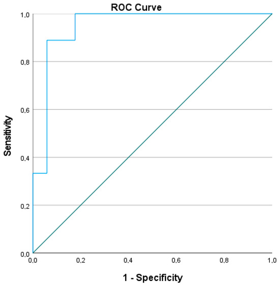 A receiver operating characteristic (ROC) curve was generated from the multivariate model to assess its discriminative performance. The area under the curve (AUC), along with the 95% confidence interval (CI), standard error (SE), and asymptotic significance (p-value), were reported. An AUC > 0.9 was interpreted as indicating excellent predictive power.