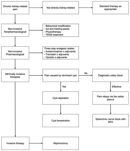Patients were analyzed and treated according to a protocol originally developed to manage ADPKD-related pain, which has been described extensively before [,,]. This protocol was adapted for kidney-related pain specifically and no longer includes treatment of liver-related pain (Figure 1). After referral, patients had an intake with a nephrologist or urologist, depending on the cause of pain, as well as with a pain specialist. Non-kidney-related pain was excluded by performing a history and laboratory assessments, as well as magnetic resonance imaging (MRI), computed tomography (CT) scan and radioisotope renography when deemed necessary. The findings were then discussed in a multidisciplinary meeting with a nephrologist, urologist, radiologist, pain specialist and, when indicated, a gastroenterologist, and an appropriate treatment was chosen to be discussed with the patient.
