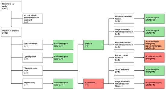 Fifteen patients were referred to our center in the context of the clinical treatment protocol. Of these patients, 3 did not receive treatment because there was no indication for it (n = 1, long-term antibiotic treatment was deemed more appropriate) or declined the treatment that was offered (n = 1, cyst aspiration, and n = 1, celiac block, both declined because pain was not severe enough to warrant treatment), leaving 12 patients for the analysis (Figure 2). Of the treated patients, one received TENS treatment as initial treatment. In terms of (minimally) invasive treatment, two patients received a cyst aspiration, eight patients received a diagnostic celiac block and one patient underwent nephrectomy. In the eight patients that received a diagnostic celiac block, six needed further treatment, which was refused by one patient (wished to focus on another medical issue), whereas the remaining five received TENS treatment (n = 1), a single splanchnic nerve block with RFA (n = 2) or multiple treatments with a splanchnic nerve block with RFA (n = 2).