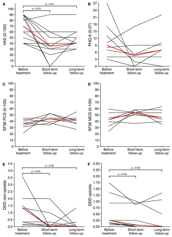 Changes in outcome variables. Statistically significant differences between time points are indicated at the top of the graphs. The red line indicates the median change in outcomes. (A) VAS score. A higher score indicates higher pain experience. (B) PHQ-9. A higher score indicates a worse quality of life. (C) SF36 PCS. A higher score indicates a better quality of life. (D) SF36 MCS. A higher score indicates a better quality of life. (E) DDD non-opioids. (F) DDD opioids. Abbreviations: DDD, defined daily dose; MCS, mental component score; PCS, physical component score; PHQ, patient health questionnaire; SF36, short form 36; VAS, visual analog scale.