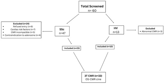 Systemic sclerosis (SSc) is a connective tissue disorder distinguished by widespread vascular abnormalities and notable fibrosis of the skin, and major organ abnormalities [1]. SSc-primary heart involvement (SSc-pHI) (excluding ischemic heart disease (IHD) and pulmonary arterial hypertension (PAH)) develops as a direct consequence of the disease and is one of the most common causes of death in SSc [2]. PAH is well described in this population; however, it has been increasingly recognized that left ventricular (LV) myocardial ischemia may underpin some of these manifestations, and that it may be expressed as a primary feature of the disease. In SSc, distinctive microvascular lesions cause significant dysfunction in the microcirculation, leading to ischemia. Interestingly, however, the prevalence of atherosclerosis in the major coronary arteries in SSc patients appears to be similar to that of the general population [1]. This suggests that while SSc disrupts the microvascular network, it does not necessarily increase the incidence of large-vessel atherosclerosis beyond what is typically observed. Therefore, the cause of left ventricular ischemia may not be driven by coronary artery disease (CAD), but rather by coronary microvascular dysfunction (CMD). Furthermore, animal models have demonstrated occlusive microvascular damage and impaired angiogenesis, referred to as capillary rarefaction [3]. This mechanism of microvascular ischemia is believed to predominate in SSc-associated cardiopulmonary complications [3,4]. A variety of imaging techniques, including transthoracic echocardiography (TTE) and cardiovascular magnetic resonance (CMR), have been used to investigate the prevalence of these cardiac manifestations. Emerging techniques show promise in enhancing this understanding and in reducing mortality and morbidity from SSc-related cardiomyopathies. Oxygen sensitive cardiac magnetic resonance imaging (OS-CMR) is a technique that has been used to directly visualize in vivo myocardial deoxygenation and subsequent ischemia. This technique relies on the effect of oxygenation on the paramagnetic properties of hemoglobin. Deoxygenated hemoglobin serves as an intrinsic contrast agent, affecting the signal intensity in OS-CMR images in a T2/T2*-dependent manner [5]. Changes in signal intensity (SI) in OS-CMR between rest and stress images reflect an inverse relationship with the concentration of deoxygenated hemoglobin. As the concentration of deoxygenated hemoglobin increases, the OS-CMR signal intensity correspondingly decreases. Recently, LV OS-CMR has played a crucial role in advancing our understanding of myocardial ischemia and various LV myocardial [6,7,8] and coronary artery diseases [9,10]. However, its efficacy in assessing LV ischemia in patients with SSc has not been studied. Hence, this is the first study to assess deoxygenation changes in response to stress using OS-CMR in SSc patients with no known cardiac disease, in order to gain a deeper understanding of the mechanisms underlying primary cardiac involvement in SSc.