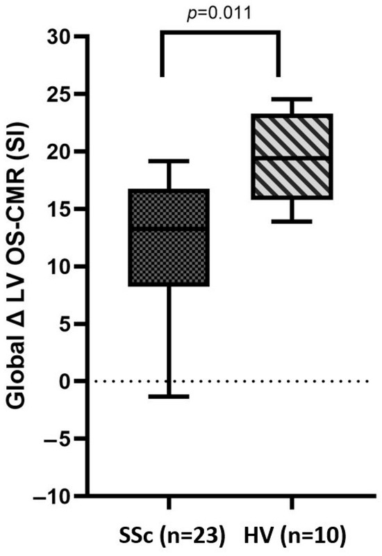 All participants completed and tolerated the adenosine-induced stress component of the OS-CMR scan. Both groups of patients had a sufficient hemodynamic stress response, as evidenced by a 10% increase from the baseline heart rate and at least one adenosine-related symptom (shortness of breath, chest tightness, flushing and transient headache). All side effects resolved shortly after stopping the adenosine infusion. There was a significantly lower ∆LV OS-CMR SI in the SSc group compared to the HV group (13.4 ± 6.5 vs. 19.5 ± 9.6, p = 0.011) (Figure 2). Furthermore, twenty (87%) SSc patients had an LV OS CMR SI change of 10% or less in at least one myocardial segment and 12 (52%) had a global LV OS CMR SI change of at least 10% or less.