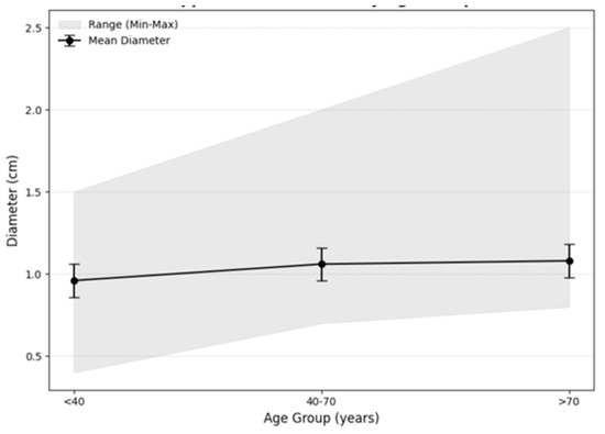 Age also played a significant role in appendiceal diameter variation. A positive correlation was observed between age and appendiceal diameter in univariate analysis (ρ = 0.132, p = 0.042), which remained significant in the multivariate model after adjusting for confounding factors (p = 0.044). When age was analyzed categorically, patients aged 40–70 exhibited larger diameters compared to those under 40 (p = 0.033), while no significant difference was observed between patients aged 40–70 and those over 70 (p = 0.086). The mean appendix diameter increased consistently with age (0.96, 1.06, and 1.08 cm), as did the minimum diameter (0.4, 0.7, and 0.8 cm, respectively), across the age groups under 40, 40–70, and over 70. The observed increase in appendix diameter with age has important diagnostic implications, particularly for older populations. Measurements that might indicate pathology in younger adults (e.g., a diameter of 1.0 cm) could represent normal findings in individuals over 70 years. This trend aligns with changes observed in other tubular anatomical structures, such as the common bile duct (CBD), where diameter increases by approximately 1 mm per decade, reflecting age-related adaptations [14,15]. These findings emphasize the diagnostic importance of accounting for age-related changes in appendiceal diameter.