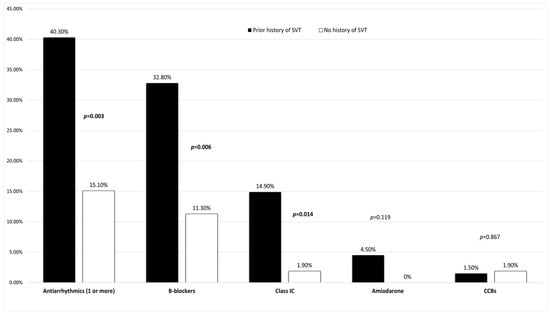 Comparison of antiarrhythmic medications in patients with and without a prior history of SVT. SVT: supraventricular tachycardia; CCBs: calcium channel blockers. Bold values indicate statistical significance (p < 0.05).