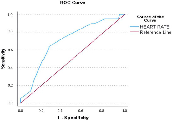 Receiver operating characteristic (ROC) curve analysis for admission heart rate yielded an area under the curve (AUC) of 0.697, with a heart rate of 165 bpm identified as the optimal cut-off (62.1% sensitivity, 72.6% specificity) for its association with elevated cTn values (Figure 2).