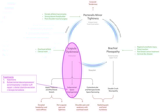 Previously, the causative relationships between the entities of PM tightness, scapular dyskinesis, and shoulder impingement has remained clouded in uncertainty and baffled surgeons [13]. PM tightness is traditionally thought to occur with impingement and cuff pathology [30] but develop after abnormal scapulothoracic motion [31,32]. Thus, while PM release has certainly been shown to improve scapular mechanics, widen the subacromial space, and decrease pain [33,34,35], “the cause of PM tightness is not fully understood” [34]. In contrast, the HDL uniquely identifies a single anatomic source as the underlying cause of scapular dyskinesis [29] and then clarifies a clear causation pathway between PM tightness, scapular dyskinesis, and subacromial impingement (Table 3). Hence, the HDL accounts for all chronic pain symptoms associated with SAPS including headaches, impingement, and neuropathy, and better identifies a broader set of patients who will benefit from PM + ICN.