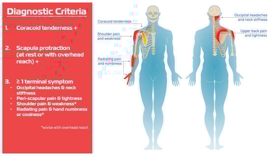 - Ahmed, A.S.; Graf, A.R.; Karzon, A.L.; Graulich, B.L.; Egger, A.C.; Taub, S.M.; Gottschalk, M.B.; Bowers, R.L.; Wagner, E.R. Pectoralis minor syndrome—Review of pathoanatomy, diagnosis, and management of the primary cause of neurogenic thoracic outlet syndrome. JSES Rev. Rep. Tech. 2022, 2, 469–488. [Google Scholar] [CrossRef]