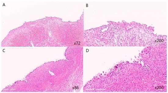 Representative histopathologic features of atypical endometriosis. (A,C) Endometriotic cyst showing attenuated endometrial lining with sparse stroma (low-power view. (B,D) Epithelial cell atypia characterized by sporadic nuclear enlargement and hyperchromasia with preservation of low N/C ratio in endometriotic cyst (high-power view). Cytologic atypia with nuclear enlargement and hyperchromasia.