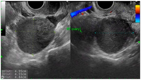 At our institution, initial gynecological examination and transvaginal ultrasonography (TVS) or transrectal ultrasonography (TRS) were performed 3–6 months postoperatively, and if the reports were unremarkable, follow-ups were performed at intervals of 6–12 months. Additional follow-ups were performed if the patient developed any symptoms. During every follow-up visit, patients were asked to fill out pain scales and specify their marital, pregnancy, and childbirth status. According to the patients’ pregnancy plan and status, we categorized them as No plan/Failure to conceive/Successful delivery/Miscarriage or ectopic pregnancy/Ongoing pregnancy or lost to follow-up (unknown pregnancy outcome after confirmed intrauterine pregnancy). Time to recurrence was defined as the time in months from the surgery to detection of a newly developed ovarian endometrioma measuring 2 cm or more. Recurrence of ovarian endometrioma was defined when TVS or TRS showed the following findings: a round cystic mass of ≥20 mm with thick walls, irregular margins, homogenous low-echogenic fluid content, scattered internal echoes, or negative papillary proliferation [13]. The representative images used for diagnosis are provided in Figure 1 (histologic images of atypical endometriosis) and Figure 2 (ultrasound images of recurrent endometrioma). If a patient had two endometriomas each measuring <20 mm, the diameters were added to obtain a value ≥ 20 mm, and this measurement was used to define recurrence [14,15]. Statistical analysis was performed using SPSS 25.0 software (SPSS Chicago, IL, USA).