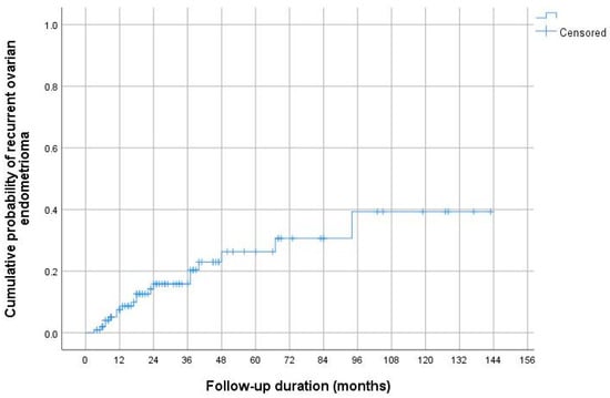 Between the recurrent (n = 19) and non-recurrent groups (n = 86), categorical variables were compared using the Chi-squared or Fisher’s exact test. Quantitative variables were compared using the Mann–Whitney U test after the normality of the data was determined using the Shapiro–Wilk test. The Kaplan–Meier method was used to calculate the cumulative probability of recurrence. A multivariable analysis including the significant variables from the univariable analysis was performed using Cox’s proportional hazards model to obtain a subset of independent risk factors for recurrence of ovarian endometrioma. Among these variables, those with a p-value < 0.2 were subjected to multivariable regression analyses. p values < 0.05 were considered statistically significant.