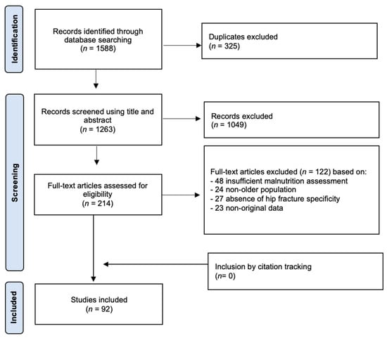 A comprehensive search was conducted across the PubMed, Scopus, and Web of Science databases to identify studies investigating the relationship between malnutrition and hip fractures in older populations. After the removal of duplicates, a total of 1263 records were screened based on their titles and abstracts. Following preliminary screening, 214 full-text articles were assessed for eligibility. Ultimately, 92 studies were included in the qualitative synthesis based on predefined inclusion and exclusion criteria (Figure 1). Full-text articles were excluded for having insufficiently detailed malnutrition assessments (n = 48), having populations other than older patients (n = 24), lacking hip fracture specificity (n = 27), and containing non-original data (e.g., editorials and reviews) (n = 23).