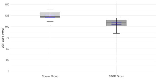 The box plot for the volume (mm3) of the left LGN in the studied group (patients with Stargardt disease—STGD) and the control group. Red diamonds indicate the mean values, while blue lines represent confidence intervals.