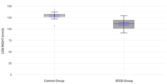 The box plot for the volume (mm3) of the right LGN in the studied group (patients with Stargardt disease—STGD) and the control group. Red diamonds indicate the mean values, while blue lines represent confidence intervals.