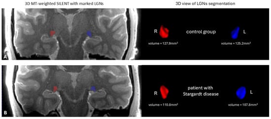 On the left—the anatomical image of the brain 3D MT-weighted SILENT with marked LGNs; on the right—3D view results of LGN manual segmentation using ITK-SNAP software, version 4.0.0-rc.2. Images show one case chosen from the control group (A) and one from patients with Stargardt disease (B). Images acquired at the Ecotech Complex (Lublin, Poland).